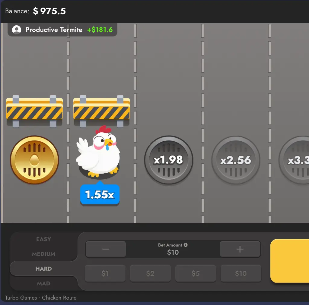 Chicken Route предлагает выбор из четырех режимов - от безопасного до экстремального. Каждый уровень меняет правила игры кардинально. Не думайте, что разница только в цифрах. Психология совсем другая: на Easy вы расслабляетесь, на Hardcore каждый клик может стоить всего банкролла.