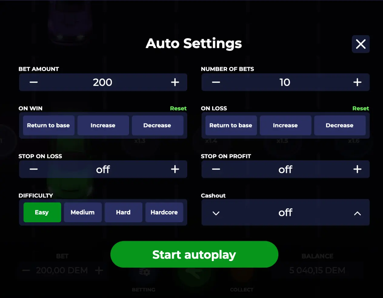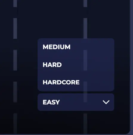 В Uncrossable Rush доступны четыре уровня сложности: Easy, Medium, Hard и Hardcore. Они выбираются как прямо на основном экране, так и в блоке Difficulty в Auto Settings. На Easy трафик спокойнее, опасных ситуаций меньше, а множители растут более плавно — это режим для аккуратной игры и теста тактики. Medium добавляет больше машин и резких манёвров: риски повышаются, но и потенциал коэффициентов становится заметно интереснее.